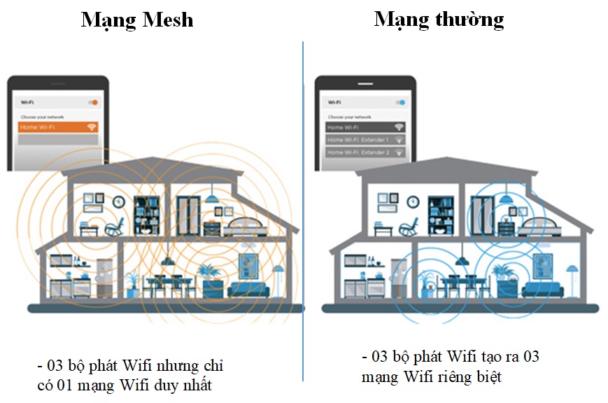 - Khắc phục được những vấn đề của Wifi hiện nay như không thể phủ sóng đều khắp, chất lượng sóng bị suy giảm theo độ xa và các vật cản, khả năng chịu tải không lớn,… Với công nghệ mesh, vùng phủ sóng Wifi rộng hơn, chất lượng sóng phủ đều, khả năng chịu tải lớn, tốc độ và độ ổn định cao, kết nối liền lạc trong toàn vùng phủ sóng nhờ chỉ dùng một SSID chung, dễ dàng lắp đặt, nâng cấp và với chi phí kinh tế hơn.